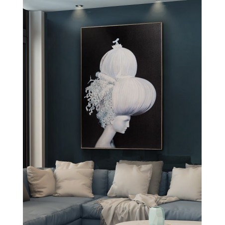 Контрастная черно-белая графика. На картине изображён женский профиль с высокой причёской в стиле графини Дюбарри, фаворитки Людовика 15, переносящий нас в атмосферу эпохи 18 века. Рама картины выполнена в цветах - черный сатин и серебро.