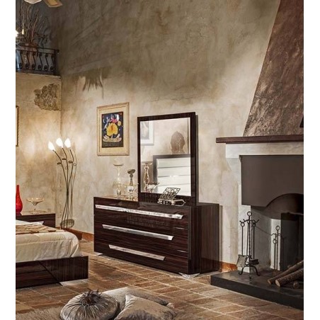 Спальня ROMANO итальянской фабрики ACCADUEO DESIGN - яркая, запоминающаяся модель. Все элементы выполнены из экологически безопасных материалов с прочным лаковым покрытием, эффективно защищающим поверхности от царапин и сколов. Мебель для спальни в цвете эбенового дерева в сочетании с блестящей хромированной фурнитурой, что делает спальню стильной и оригинальной. Высокое мягкое изголовье кровати в отделке светлой перламутровой экокожи.